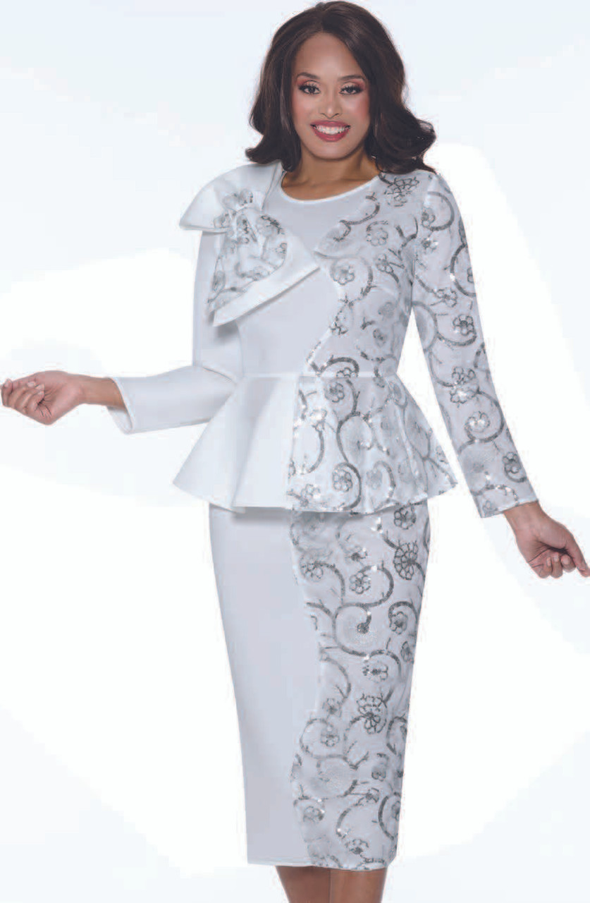2Pc Jacket and Skirt Set in Scuba and Sequins Design with Peplum Jacket and Elaborate Shoulder Bow Embellishment